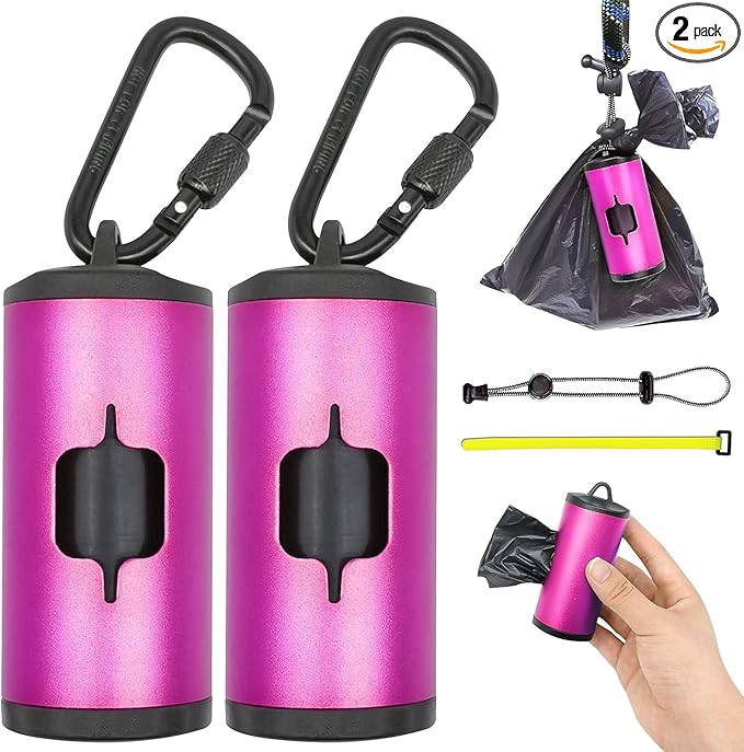 2 Pack Metal Dog Poop Bags Holder Aluminum Poo Bags Dispenser with 30 Black Unscented Pet Waste Bags and 3 Leash Accessories for Dog Walking(2 Holders 30 Bags,Pink)