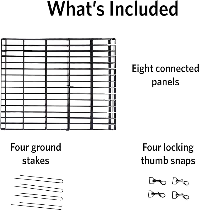 • Includes 4 ground anchors for outdoor use and 4 thumb-snaps for easy assembly; Easy set-up and no tools required for assembly; Exercise Pen includes 1 year manufacturer's warranty