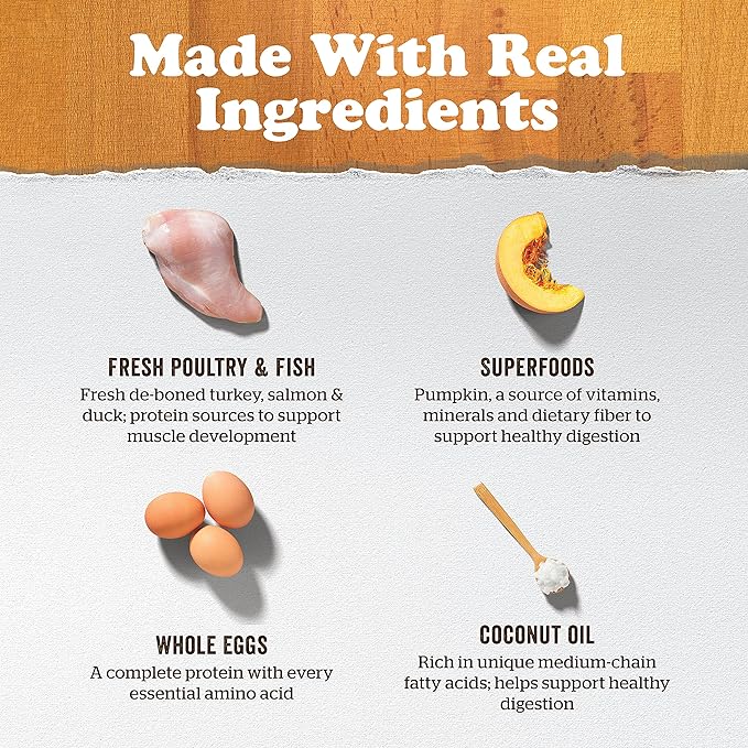 • REAL MEAT & FISH: Grain free dog food recipe made with only fresh de-boned meats & fish for protein, omega 3s & 6s, and a delicious taste. With premium-quality turkey as the first ingredient plus fresh salmon & duck. No by-product or meat meals.