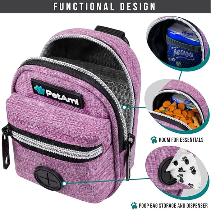 PetAmi Dog Poop Bag Holder for Leash, Dog Pet Waste Bag Dispenser For Poop with Clip for Doggie Puppy Walking Accessories Travel Camping, Dog Treat Pouch Supplies Must Have With Doggy Bag Roll, Purple