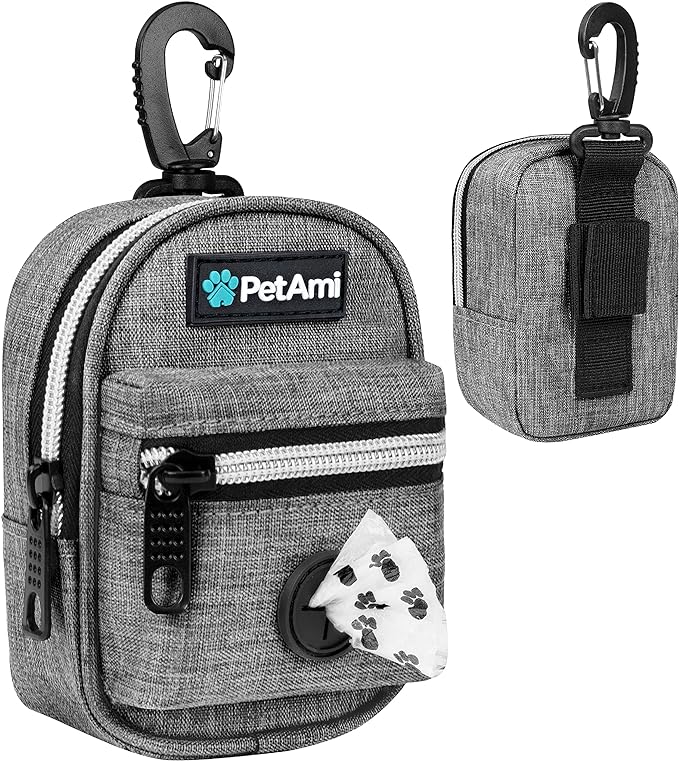 • GRAY DOG WALKING BAG: PetAmi poop bag holder dispenser includes one roll of dog poop bags, measures 4.7 x 1.8 x 3 inches, and is made of durable oxford polyester. Cute mini backpack doggy trash bag carrier is refillable and is compatible with most dog poop bag rolls. This pet travel bag is a great gift for dog mom, dad, parents, owners and trainers. Comes in multiple colors to mix and match your dog leash.