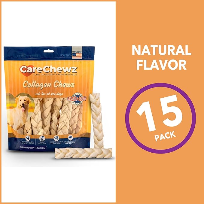 Pet Factory CareChewz Collagen 6-7" Skinny Braided Sticks Dog Chew Treats - Natural Flavor, 15 Count/1 Pack