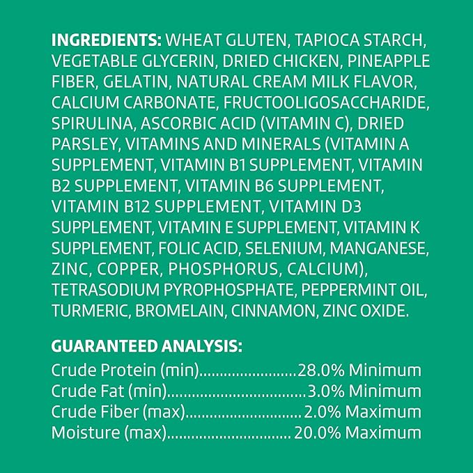• Minty Fresh Dental Care - Each treat meets your dog’s chewing needs while promoting daily dental hygiene, now with a burst of fresh mint to enhance breath freshness alongside the benefits of real chicken flavor