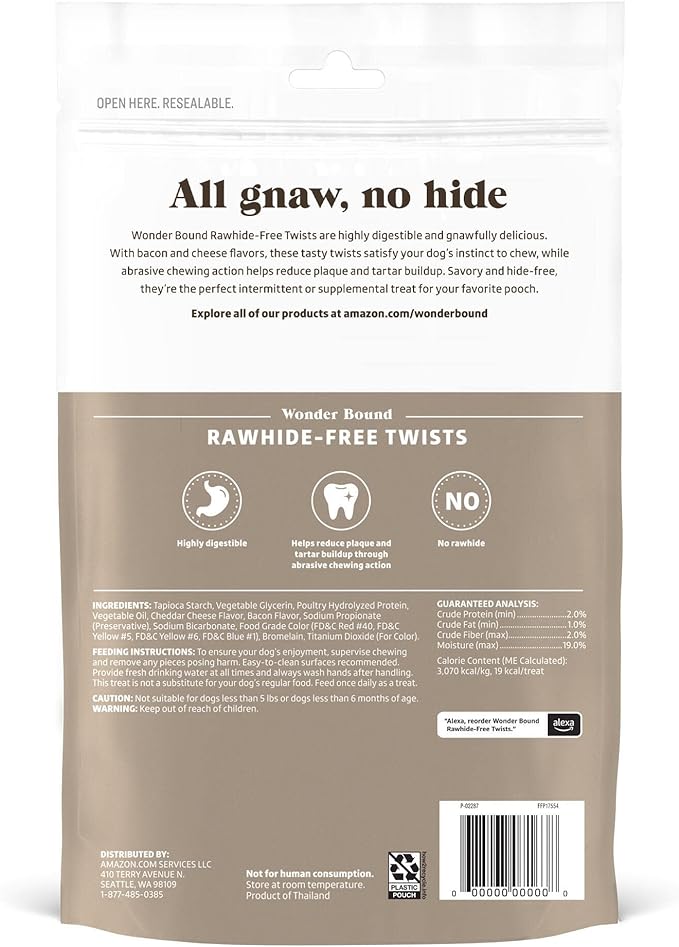 • Bacon & Cheese Flavor Twist - Dive into flavor with Wonder Bound's Bacon & Cheese Flavor Dog Twist Sticks, combining the smokiness of bacon and the richness of cheese in a twist stick that's irresistible to canines