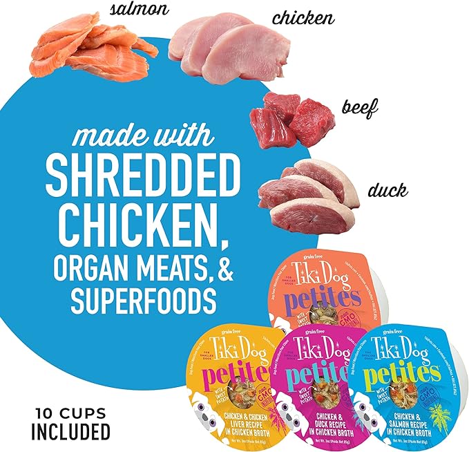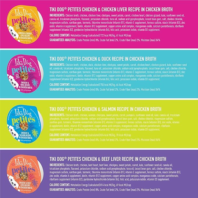 • DESIGNED FOR SMALL TO MEDIUM SIZED DOGS - Tiki Dog Petites Grain Free Wet Dog Food is a convenient, ready-to-eat, complete & balanced meal for your small breed dogs.