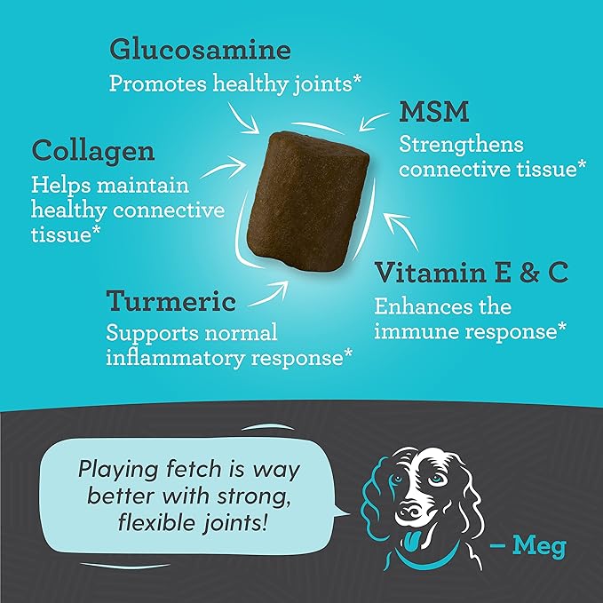 • ✓ ADDED COLLAGEN WHY SHOULD YOUR DOG SETTLE FOR LESS? - Collagen is found in many human supplements but not in pet supplements because it’s an expensive ingredient. At Meg & Hugo we don’t believe our dogs deserve inferior nutrition. Our Mobility Chews include type 1 & 3 Collagen, not just glucosamine for dogs. Type 1 Collagen provides structure to your dog’s skin, bones tendons, cartilage, connective tissue and teeth. Type 3 Collagen supports the structure of muscles, organs and arteries.