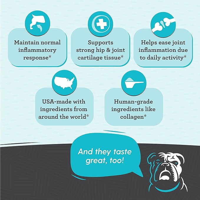 • ✓ PREMIUM HIP & JOINT SUPPORT –Vets recommend our Dog Hip and Joint supplements for dogs because its unique premium ingredients focus on supporting joint, cartilage, connective tissue, muscle health and help support a healthy inflammatory response. Each chew includes high strength Glucosamine HCl, Chondroitin Sulfate, Flaxseed for Omega 3, Collagen, MSM, Turmeric, Hyaluronic Acid, Vitamin C and E. This put the spring back in the step of Hugo our English Bulldog and is suitable for all breeds.