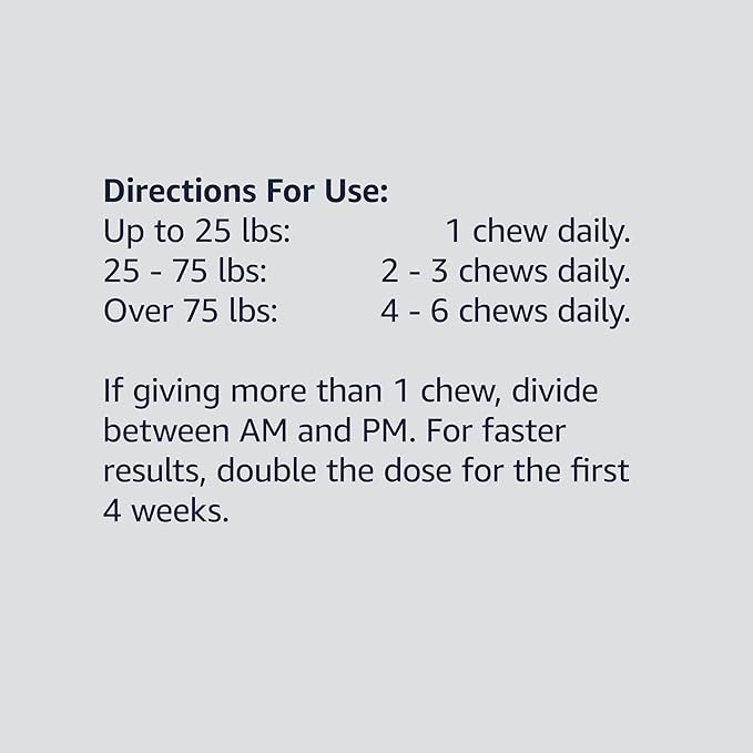 • Direction for use: 1 chew per day for dogs up to 25 lbs, 2-3 chews per day for dogs 25-75 lbs, 4-6 chews per day for dogs over 75 lbs