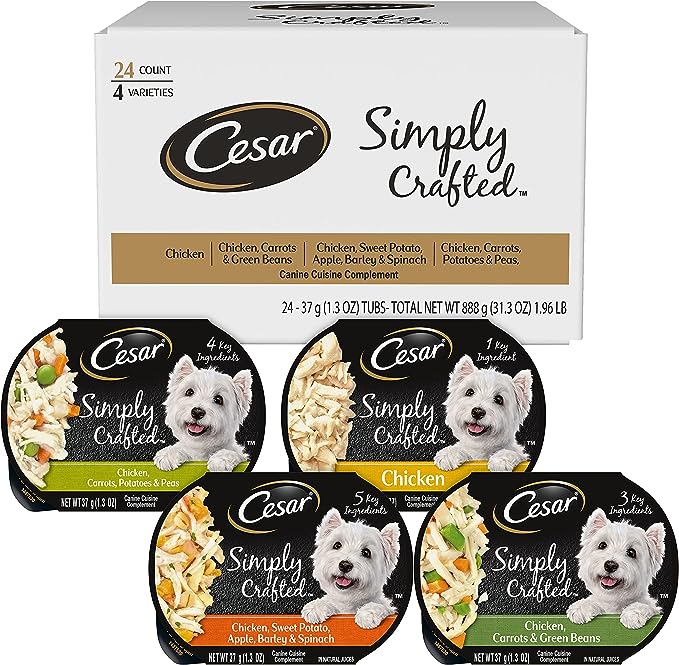 • 24-Pack: Contains twenty-four (24) 1.3 oz of CESAR SIMPLY CRAFTED Wet Dog Food Cuisine Complement including (6) Chicken, (6) Chicken, Carrots & Green Beans, (6) Chicken, Sweet Potato, Apple, Barley & Spinach, and (6) Chicken, Carrots, Potatoes, & Peas