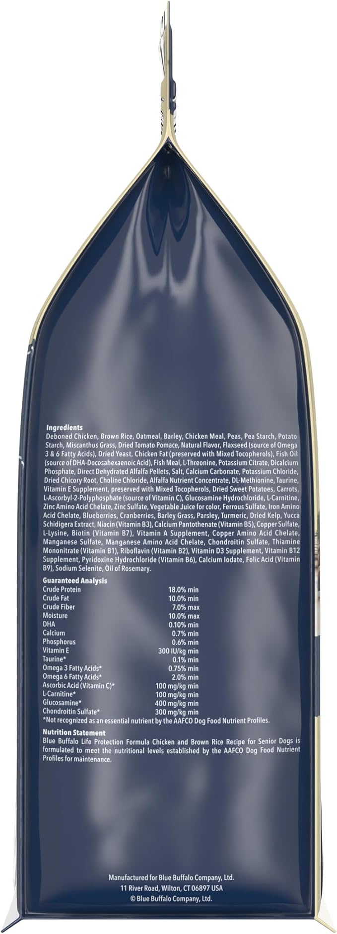 • Packaging may vary: Contains one (1) 5 lb. Bag of BLUE Life Protection Formula Senior Dry Dog Food, Chicken and Brown Rice