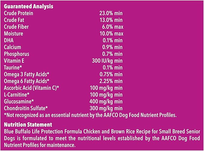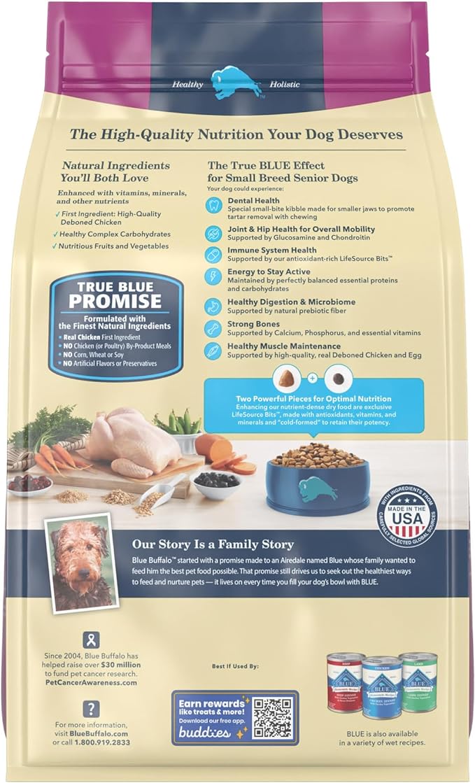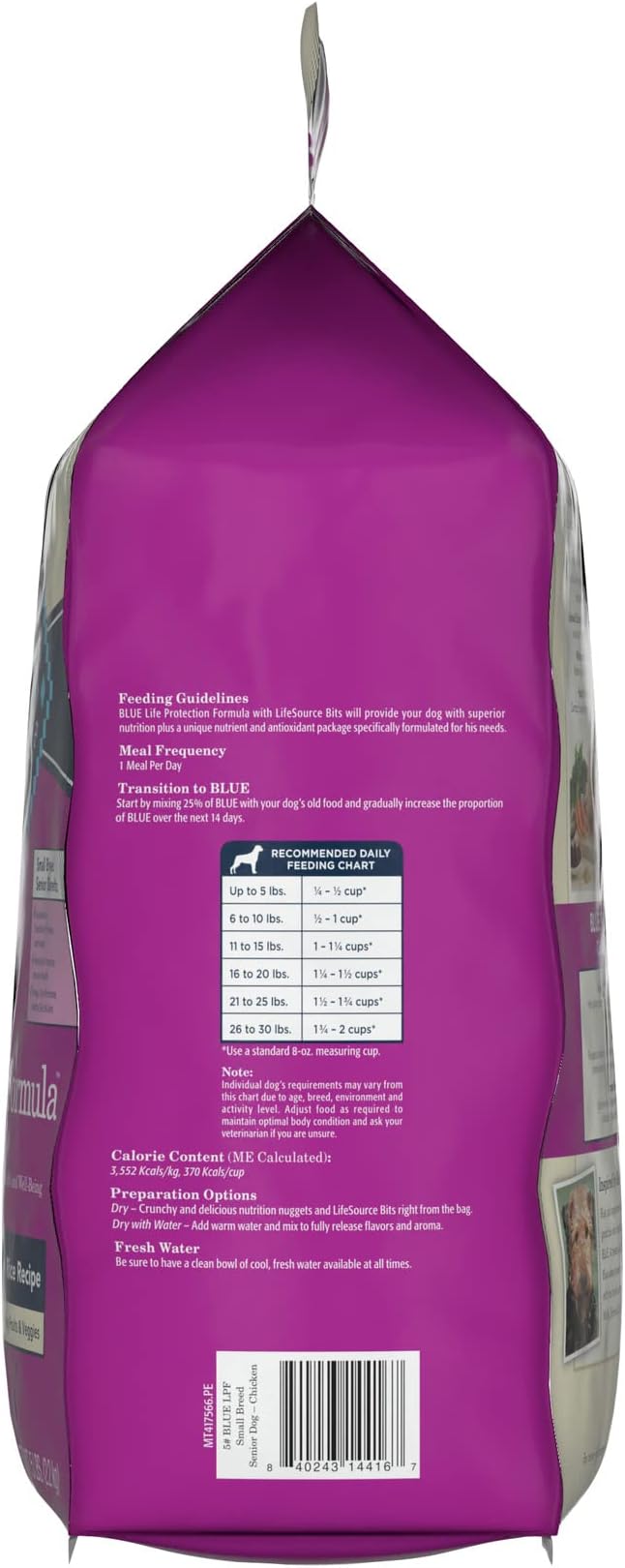 • PACKAGING MAY VARY: Contains one (1) 5 lb. Bag of BLUE Life Protection Formula Small Breed Senior Dry Dog Food, Chicken and Brown Rice