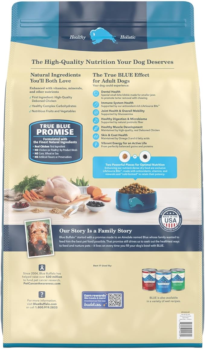 • SMALL BITE DOG FOOD: Made especially for dogs who prefer smaller kibble, BLUE Life Protection Formula Small Bite dry dog food contains essential proteins and carbohydrates to help meet energy requirements in a uniquely shaped bite