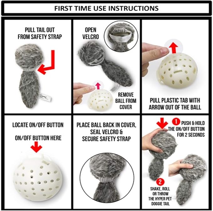 • TIPS TO ACTIVATE – On/Off button on this plush dog toy is located on the top of the plastic ball. Press the button and hold for 2 seconds to turn the ball on. To activate, shake, roll, or throw Hyper Pet Doggie Tail. The random motion will continue for approximately 10 seconds. Once action stops, rock, roll, or throw the interactive dog toy again to reactivate and continue play. When playtime is over, simply press the button to turn the dog ball off.