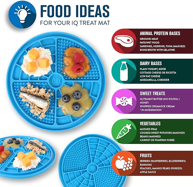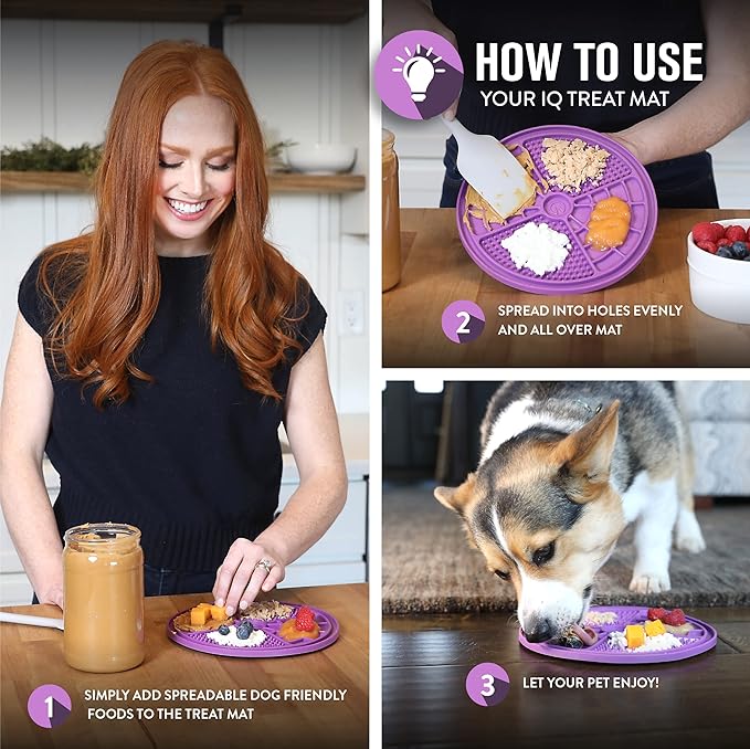 • HEALTH BENEFITS: Great for cat and dog dental care at home, our dog lick mat and cat food mat promotes fresh breath by scraping the tongue. It also improves digestion by slowing down their eating. Just sprinkle dog calming chews - anxiety relief treats as a special snack.