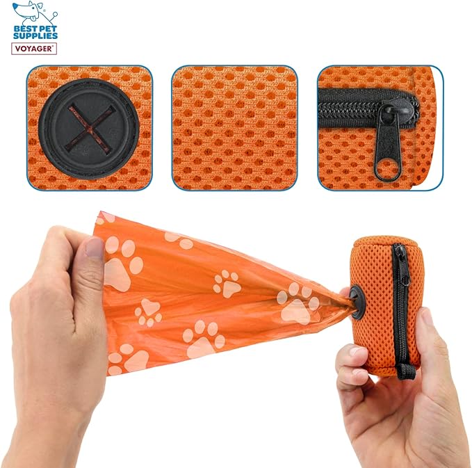 Best Pet Supplies Dog Poop Bag Holder Leash Attachment with 15 Bags, Orange, Reusable Mesh Dispenser Pouch for Travel, Walking, Park, and Outdoor Use, Soft and Durable with Clip-On