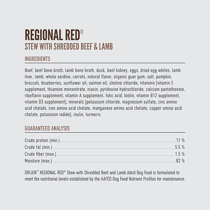 • Twelve (12) 12.8 oz cans of ORIJEN REGIONAL RED Stew Wet Dog Food