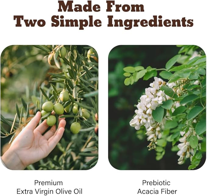 • MADE IN THE USA WITH NATURAL INGREDIENTS THAT ARE SUSTAINABLE AND TRACEABLE: The Meaningful Tree formula combines all of the health benefits of the very best extra virgin olive oil, with acacia fiber, a natural and effective prebiotic. We are made in the USA with ingredients that are sustainable and traceable down to our very trees.