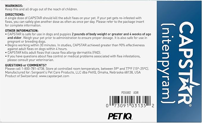 • Fast-Acting Flea Treatment: Capstar (nitenpyram) starts killing adult fleas in just 30 minutes