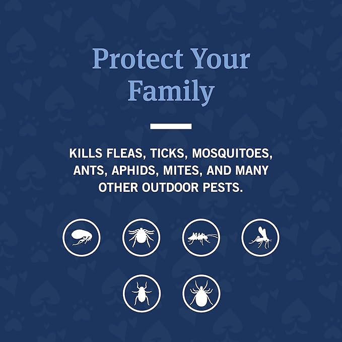 • Kills fleas, ticks, mosquitos, aphids, mites, and many other outdoor pests