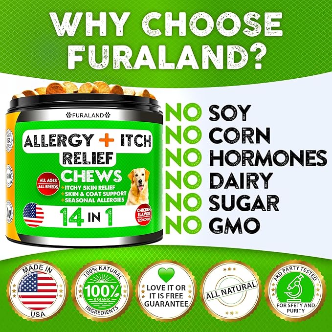 • Allergy Relief - prevent environmental pollutants, seasonal and food allergies, ease symptoms like paw licking, itching, chewing & scratching, irritation, bald spots, rashes and hot spots