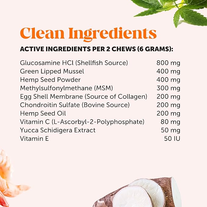 • EASES JOINT STIFFNESS DUE TO NORMAL DAILY ACTIVITY - As dogs age, discomfort can occur in the hips and joints, which can lead to reduced movement and arthritis pain. With our Senior Hemp Mobility chews, a powerful combination of ingredients including Glucosamine, Turmeric, Organic Hemp and Green Lipped Mussels work together to support a normal inflammatory response, ease joint stiffness and provide building blocks for synovial fluid, cartilage and connective tissues.
