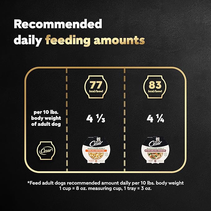 • 6-Pack: Contains three (3) 3 oz. packs of CESAR WHOLESOME BOWLS Beef, Chicken, Carrots, Barley & Green Beans Recipe and three (3) Chicken, Apple & Sweet Potato Recipe Variety Pack Adult Wet Dog Food