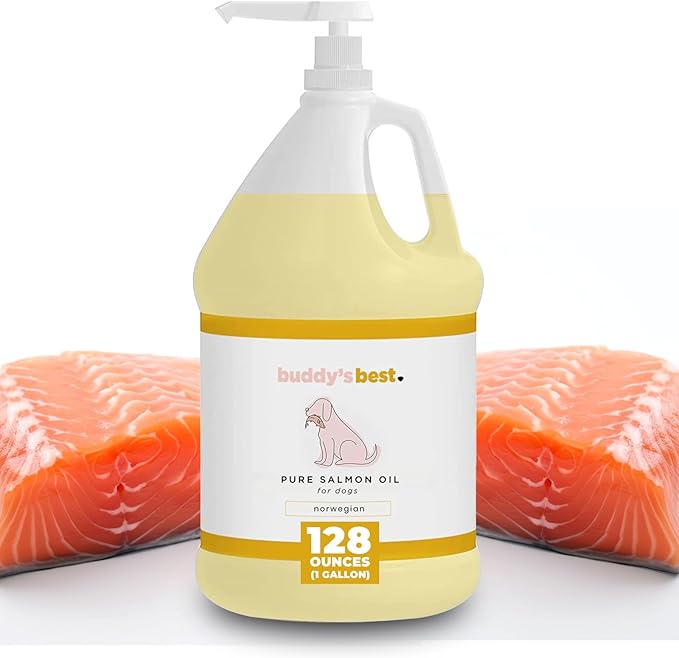 Buddy's Best, Salmon Oil for Dogs - 100% Pure Norwegian Virtually Odorless Fish Oil - Omega-3 Supplements for Dogs & Cats - Promotes Healthy Skin and Coat - Dog Food Oil in Pump Bottle (1 Gallon)