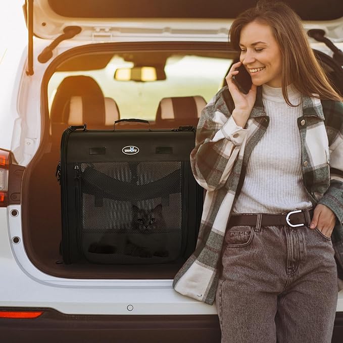 • 🐶【VENTILATED & WASHABLE】: ①Large Dog Travel Carrier has 4 sides breathable & anti-scratch mesh window; ② Washable Mat with a hard panel to stand lying inside;③ More stable Dog Crates add reinforced plastic sheet on the top and use stronger steel material on the frame, which can keep the shape from collapsing; ④ 2 pcs of the adjustable hammock for cats.