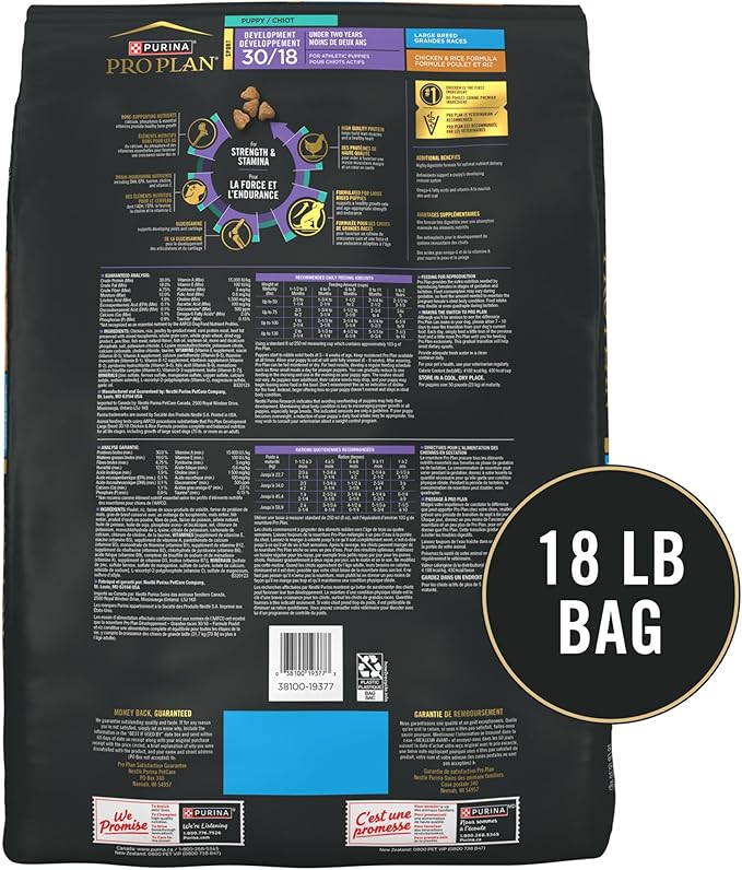 • Purina large breed puppy food supports a healthy growth rate and age-appropriate strength and endurance