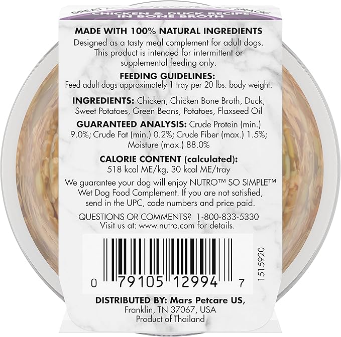 • Contains: Ten (10) 2 oz. tubs of NUTRO So Simple Meal Complement Wet Dog Food Chicken & Duck Recipe in Bone Broth.