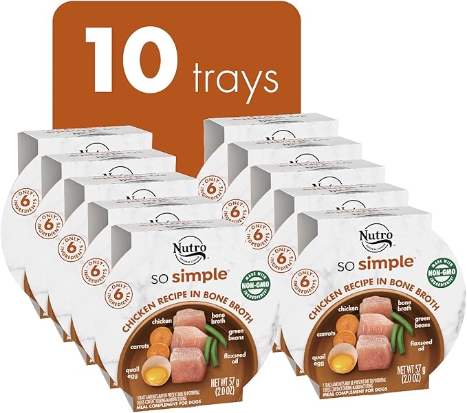 • Contains: One (1) 10-count pack of 2 oz. tubs of NUTRO So Simple Meal Complement Wet Dog Food Chicken Flavor Recipe in Bone Broth.