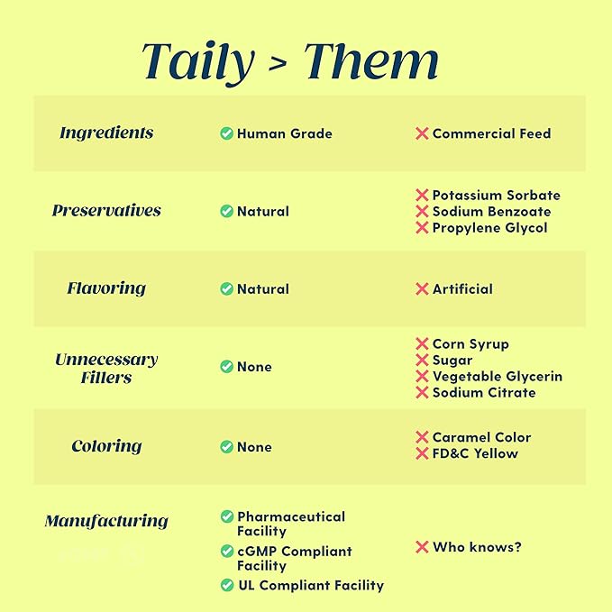 • 🌿 🧪 Natural Preservatives: At Taily, we believe in providing our pets with the best care possible. That's why our supplements are free from artificial preservatives and flavors, ensuring a clean and safe supplement that your furry friends will love.