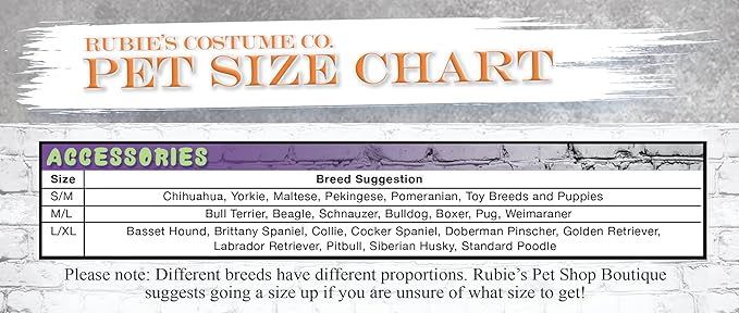 • READ THE RUBIE’S PET SIZE CHART and WATCH THE SIZING INSTRUCTION VIDEO, do not select size based on breed