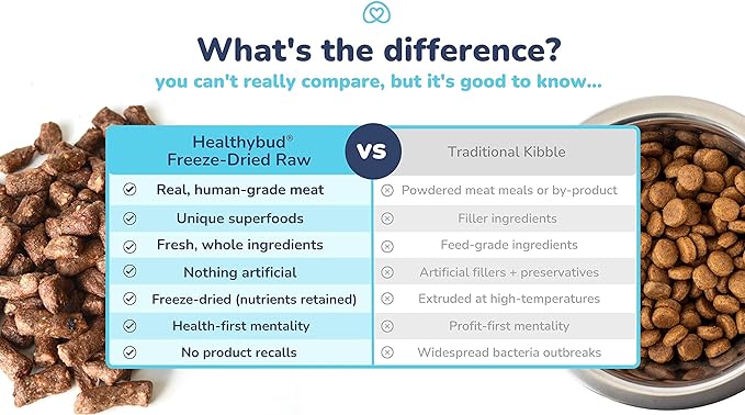 • 85% BEEF MEAT, ORGANS & BONES - Healthybud's Beef Meal Bites are grain free, with 85% real pure meat, liver, heart, and bones; 15% fruits, veggies, and superfoods. Our freeze-drying process preserves the nutritional value of all ingredients at their peak value