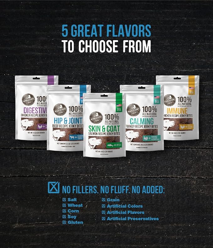 • NO FILLERS, NO FLUFF: Give your dog jerky treats without the fillers. These hip and joint support treats are made with no added salt, wheat, corn, soy, gluten, grain, artificial colors, artificial flavors, or artificial preservatives.