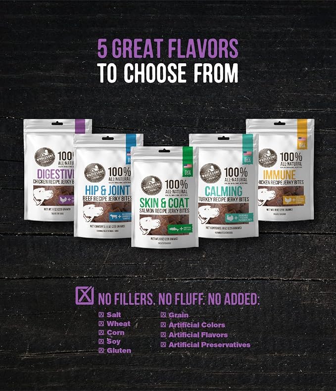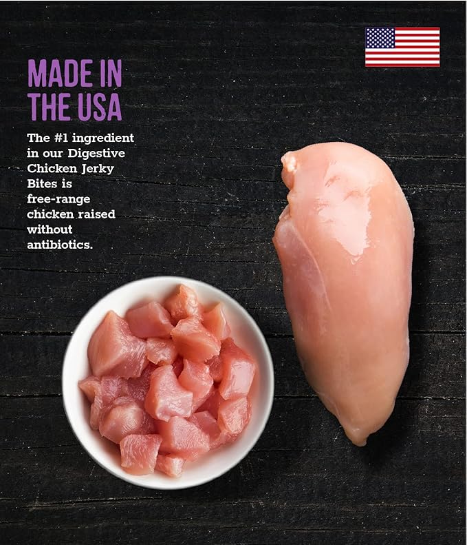 • USA CHICKEN #1 INGREDIENT: Like all Wholesome Pride dog treats, our Digestive Support Jerky Bites are made in the USA with 100% all-natural ingredients,