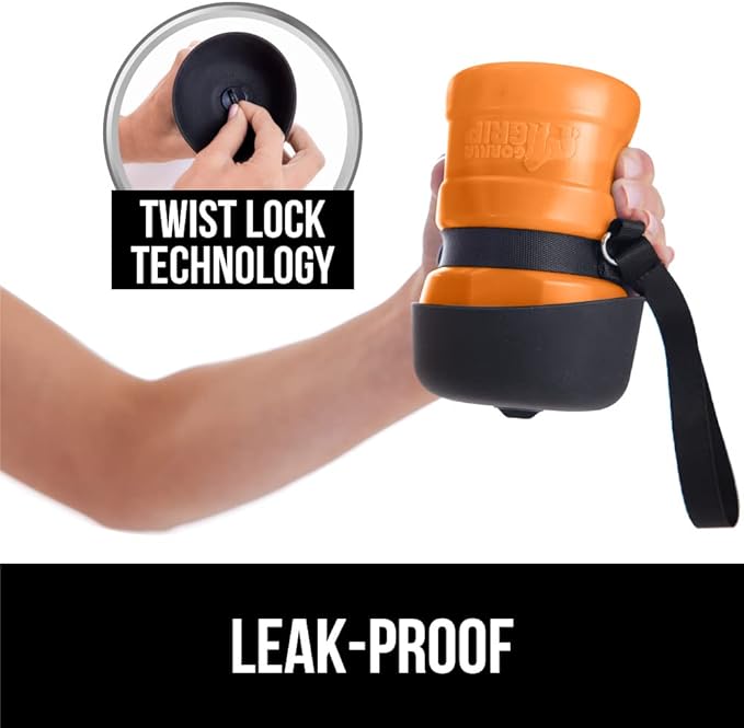 • LEAKPROOF DESIGN: pet water bottle is designed with an easy twist lock mechanism located at the bottom of the silicone bowl; twist the lock to create an air tight seal that helps prevent water from leaking out of the bottle