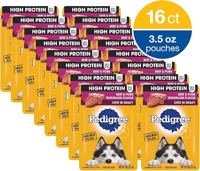 • CONTAINS: Sixteen (16) 3.5 oz. pouches of PEDIGREE High Protein Wet Dog Food Pouches, Beef and Pork Tenderloin Flavor Cuts in Gravy