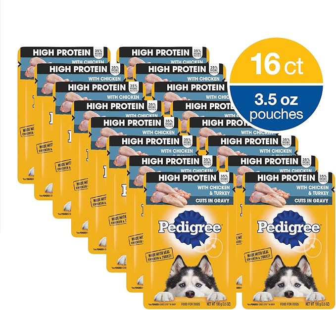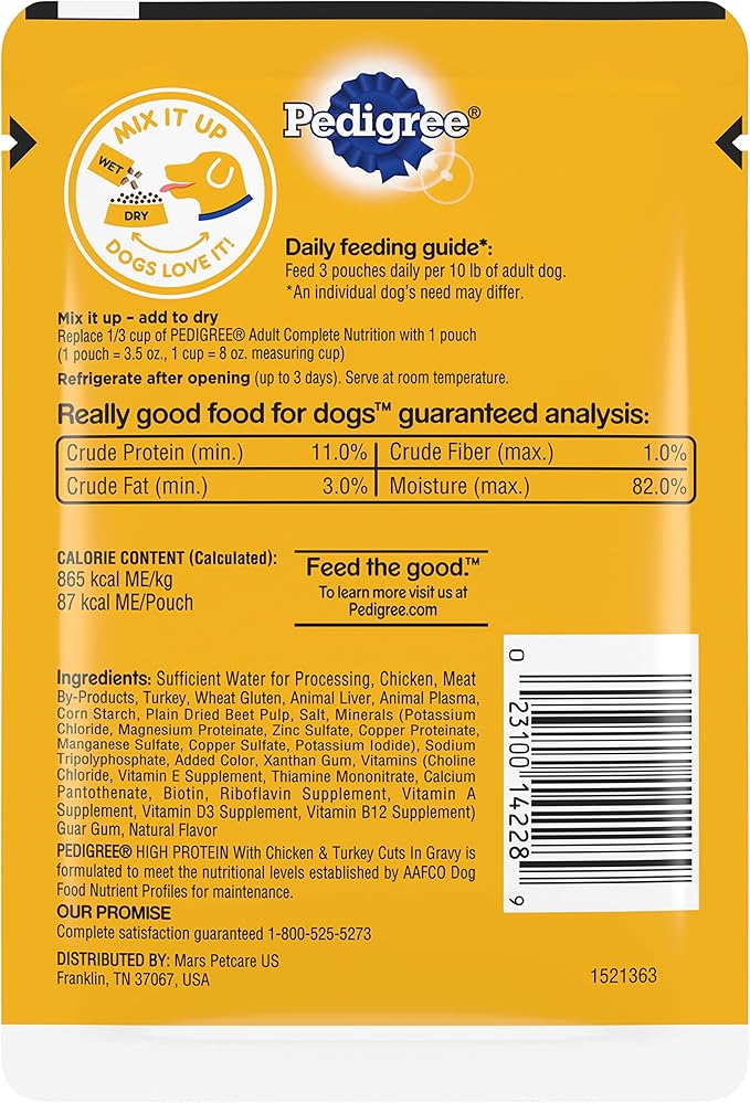 • CONTAINS: Sixteen (16) 3.5 oz. pouches of PEDIGREE High Protein Wet Dog Food Pouches, with Chicken and Turkey Cuts in Gravy