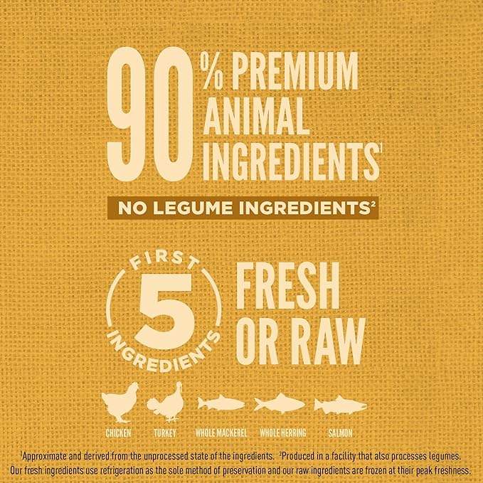 • The first five ingredients are fresh or raw chicken, turkey, whole herring, whole mackerel and salmon to provide your dog with essential protein, vitamins and minerals, as well as grains sourced from non-GMO crops