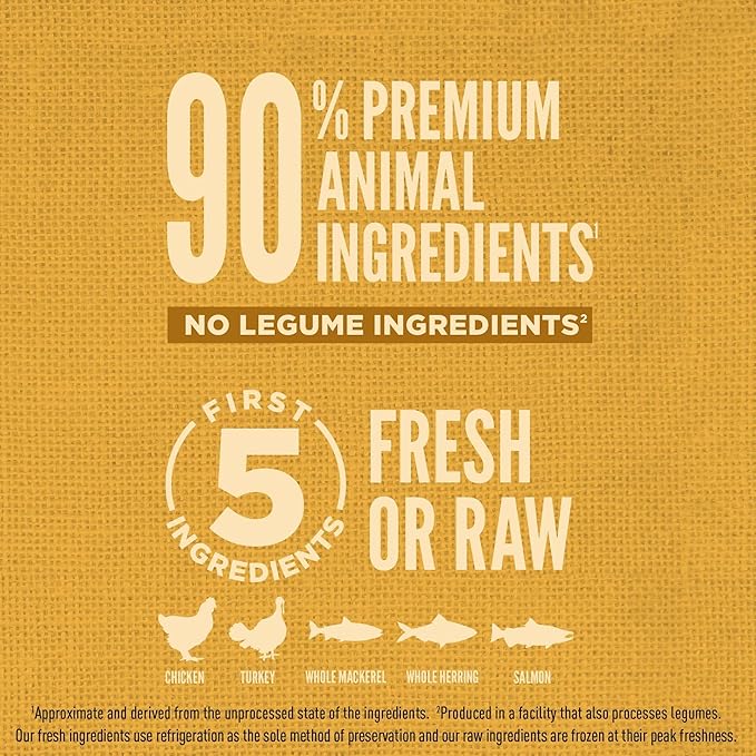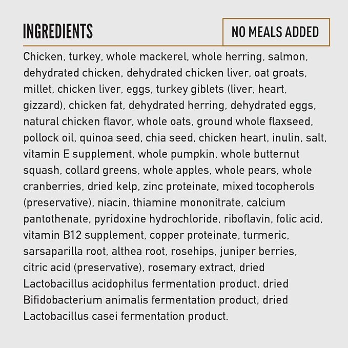 • The first five ingredients are fresh or raw chicken, turkey, whole herring, whole mackerel and salmon to provide your dog with essential protein, vitamins and minerals, as well as grains sourced from non-GMO crops