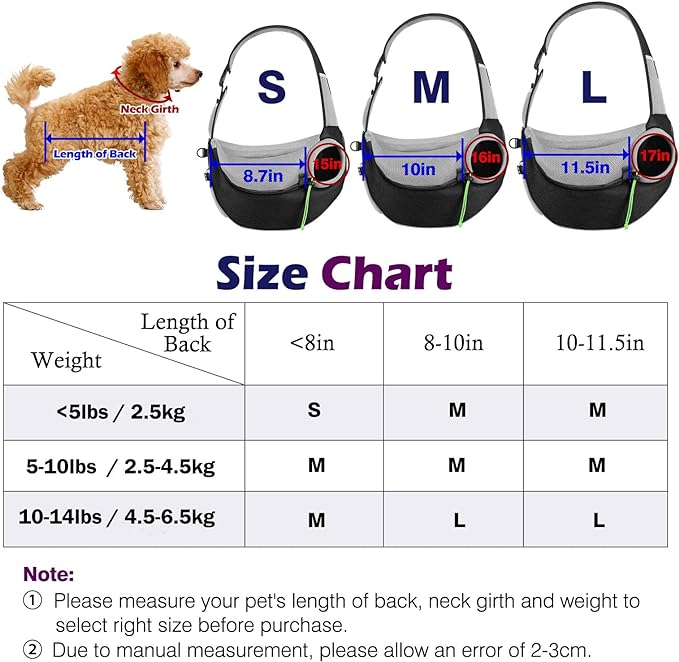 • 【Multi-size and Wide Application】 Our dog crossbody satchels are available in three sizes (S: 40*22*10cm / M: 47*29*14cm / L: 50*30*16cm) and in a variety of colors. Please measure your pet's SIZE & WEIGHT according to the Size Chart before purchasing. The hand-free design make it perfect for everyday use such as shopping, biking, traveling and mountain climbing. Let your dog be by your side at all times!