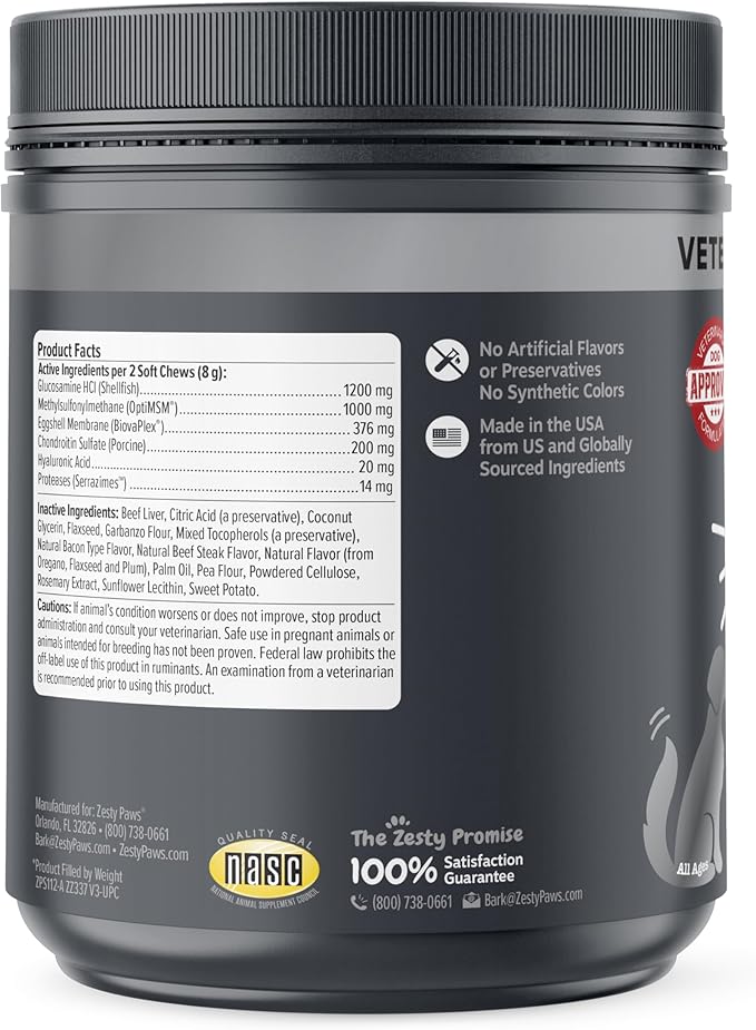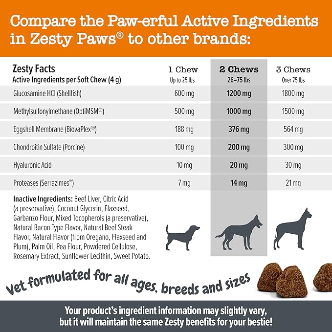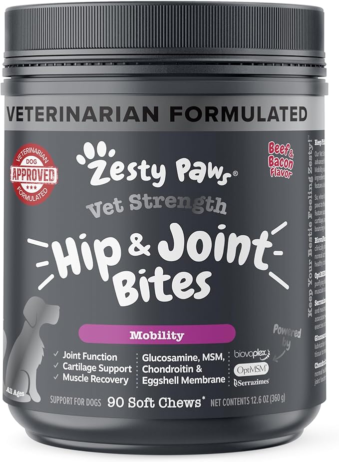 Zesty Paws Vet Strength Mobility Bites Beef & Bacon Flavor Hip & Joint Support Chews for Dogs with Glucosamine, Chondroitin, MSM, Hyaluronic Acid & Serrazimes - 90 Count
