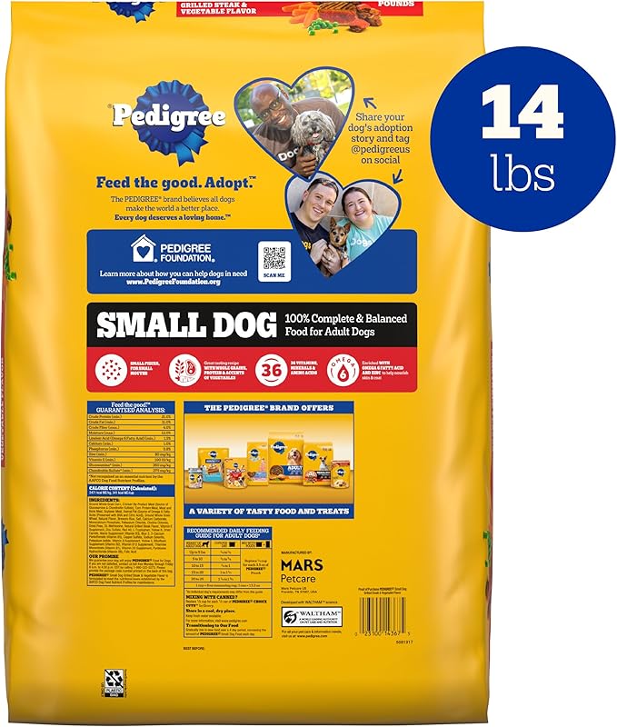 • Contains one (1) 14 lb. Bag of Pedigree Complete Nutrition Adult Small Dog Dry Dog Food, Grilled Steak and Vegetable Flavor.