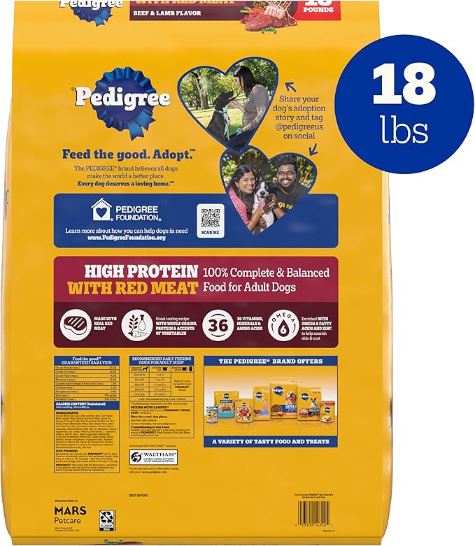 • Contains one (1) PEDIGREE High Protein Adult Dry Dog Food Beef and Lamb Flavor Dog Kibble, 18 lb. Bonus Bag