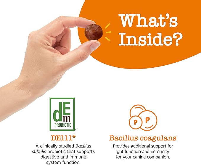 • Premium DE111 Probiotic - Does Fido want probiotics? This chewable functional supplement contains DE111, a clinically studied Bacillus subtilis that supports digestive function and the immune system.