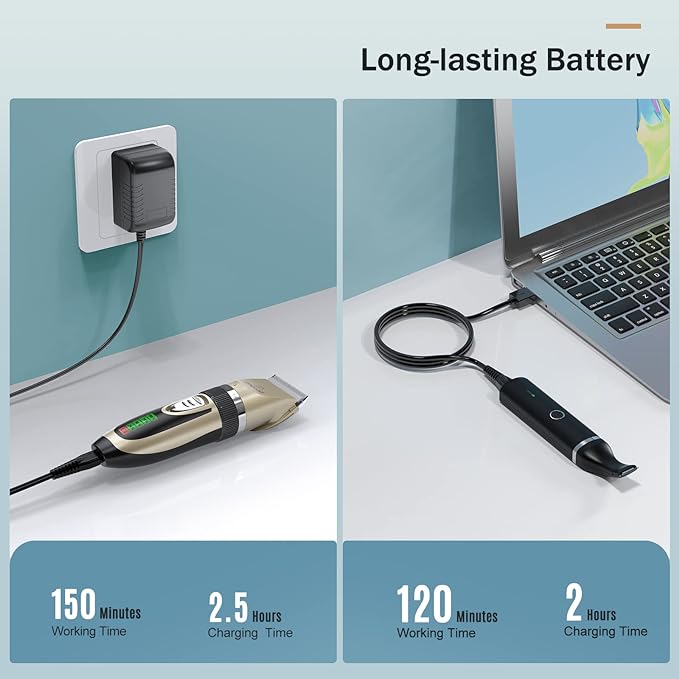 • Cordless Design, Easy to Use: You could use our dog clippers with a cordless status as well as used when charging. With the cordless clipper, you will never be bothered by the trouble of replacing batteries or boring wires anymore. Quite easy to use even for Green hand!