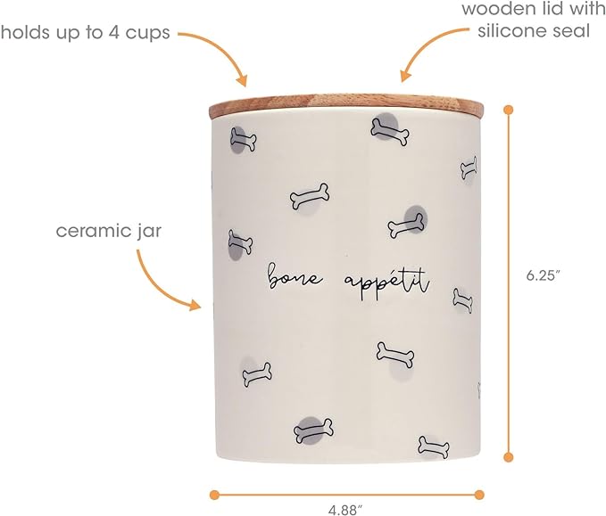 • Dishwasher Safe: This beige ceramic treat canister with a neutral wooden lid features a silicone seal to keep your dog food fresh. This treat jar is microwave safe and dishwasher safe making it easy to clean