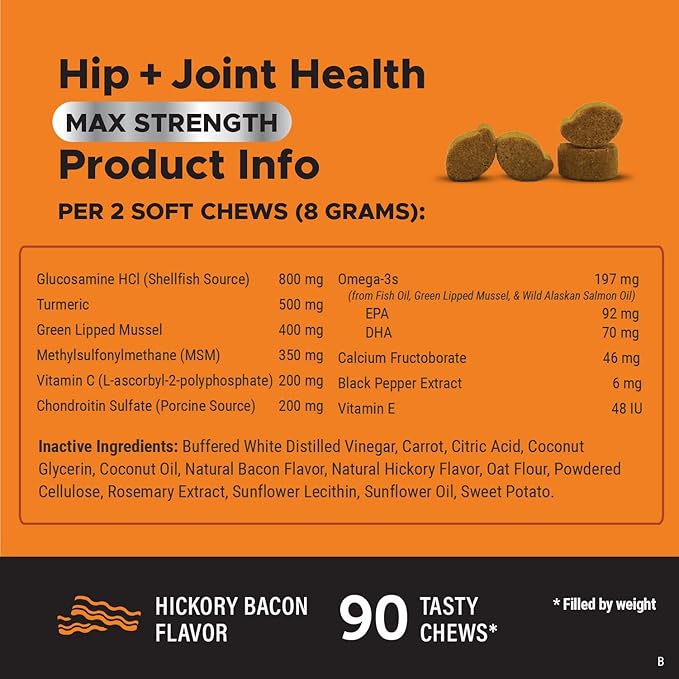 • BUILT ON OUR EXCLUSIVE NATURAL PURE VITALITY BLENDTM: Hip + Joint Health Max Strength is formulated with our Pure Vitality BlendTM, made with natural ingredients you can find in your own pantry. We combine this nutritious blend with powerful, research-backed active ingredients to best support your dog where they need it most. These easy-to-give chews help provide maximum support to your dog’s joints, mobility, and flexibility. Plus, your dog will love the delicious hickory smoked bacon flavor!