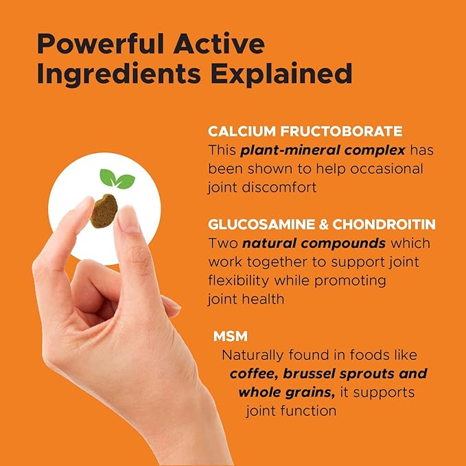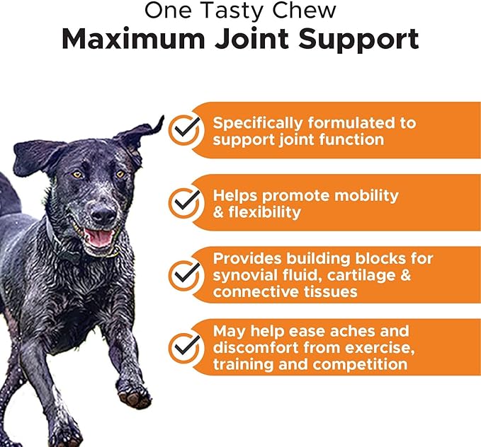 • MADE WITH NATURAL & OTHER PREMIUM INGREDIENTS LIKE CALCIUM FRUCTOBORATE, GLUCOSAMINE, & MSM: Hip + Joint Health Max Strength chews help ease inflammation from daily activities, reduce oxidative stress, & maintain healthy cartilage and strong bones, all important factors when it comes to your pup’s mobility and hip & joint health. This advanced formula contains powerful ingredients that may also help with discomfort from normal daily activities & help ease aches caused by training & competition.